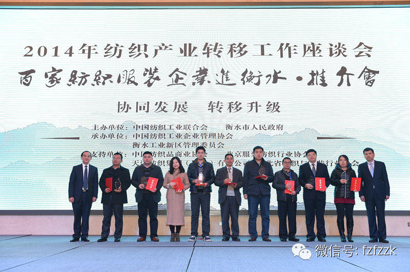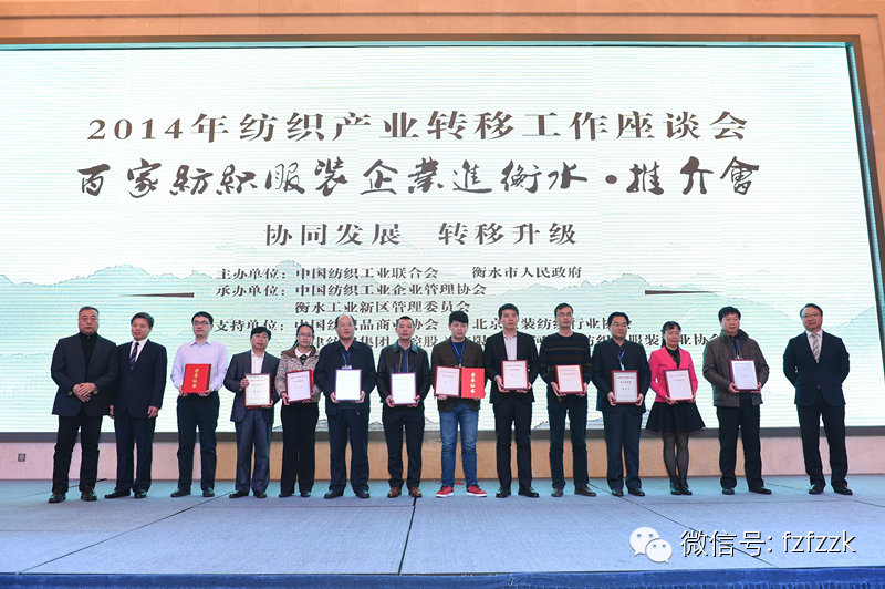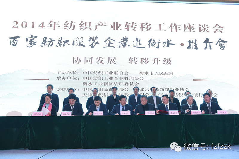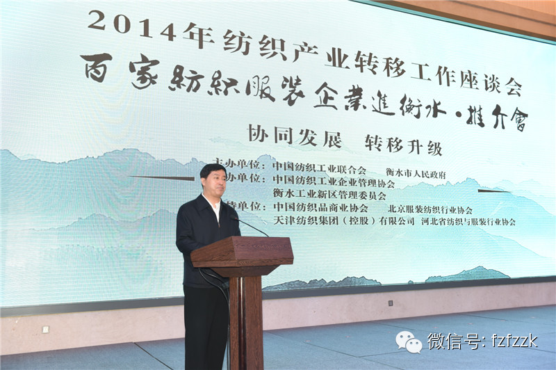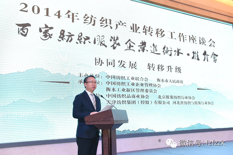 1月15日,2014年纺织产业转移工作座谈会暨百家纺织服装企业进衡水推介会在河北衡水举行。中国纺织工业联合会会长王天凯,河北省副省长张杰辉,中国纺织工业联合会副会长、中国纺织产业转移工作办公室主任孙瑞哲,中国纺织工业联合会副秘书长、中国纺织产业转移工作办公室常务副主任杨峻,中国纺织服装教育学会会长倪阳生,中国服装协会专职副会长冯德虎,衡水市委书记李谦,衡水市长杨慧等领导出席会议。